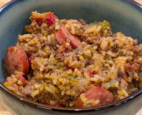 A hearty Cajun-inspired one-pot dish of ground beef, smoked sausage, rice, and vegetables simmered in bold spices and tomatoes for a rich, flavorful meal.