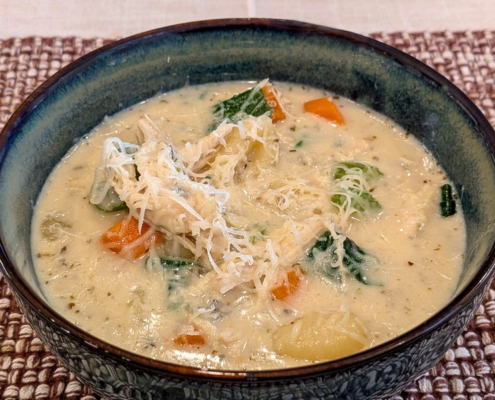 A creamy chicken and gnocchi soup made with tender shredded chicken, vegetables, herbs, and spinach in a rich Parmesan broth.