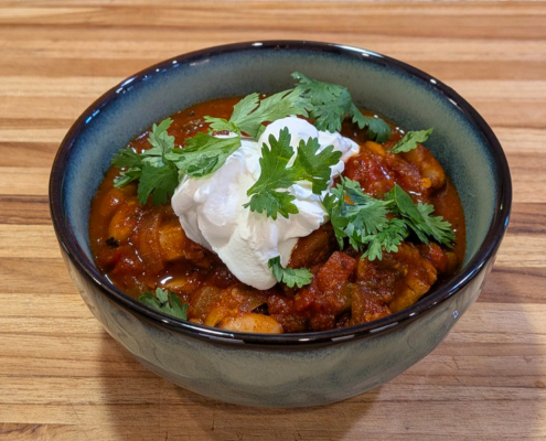 A hearty chicken and butternut squash curry in a creamy coconut sauce, served over brown rice and topped with fresh cilantro.