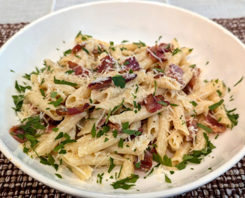A creamy, indulgent penne Alfredo tossed with crispy bacon and finished with fresh parsley and Parmesan.