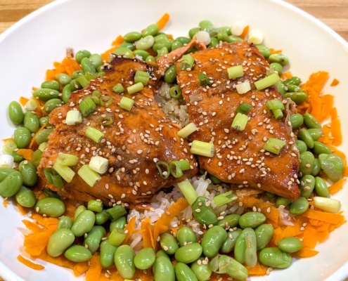 A sweet-savory miso honey–glazed salmon served over rice with crisp vegetables and edamame for a colorful, nourishing bowl.