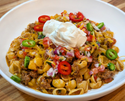 A spicy and creamy taco pasta with seasoned ground beef, cheddar cheese, fresh salsa, and jalapeños.