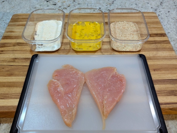Bowl 1: Flour Bowl 2: Beaten egg Bowl 3: Breadcrumbs mixed with garlic powder, paprika, salt, and black pepper.