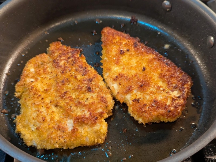 Coat each chicken piece in flour, then dip in egg, and finally coat evenly with the breadcrumb mixture. Heat vegetable oil in a large skillet over medium heat. Fry the chicken pieces for 3-4 minutes per side until golden brown and fully cooked. Set aside on a paper towel-lined plate.
