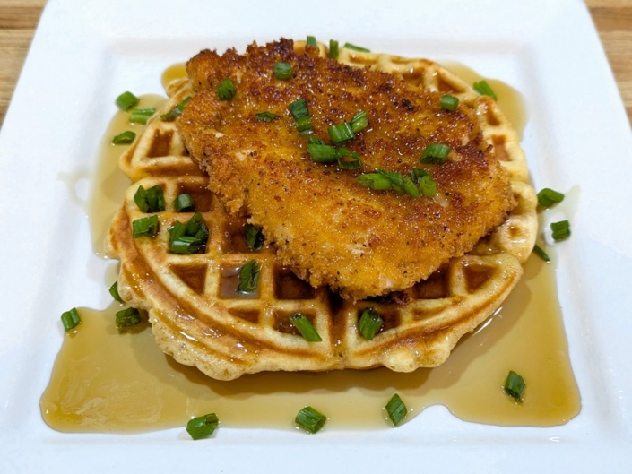 A crispy twist on comfort food, this recipe pairs golden, pan-fried chicken schnitzel with fluffy, homemade waffles, finished with a drizzle of maple syrup or honey and fresh herbs.
