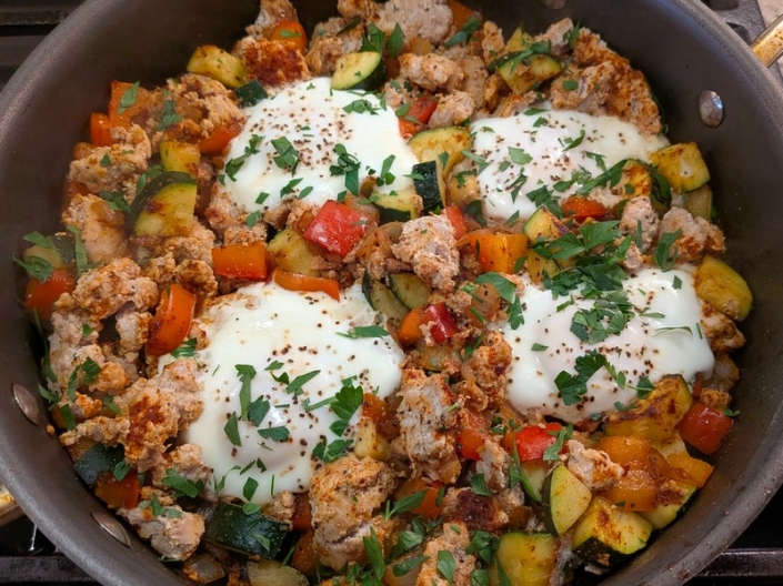 A hearty, protein-packed skillet hash of seasoned ground turkey and sautéed vegetables, topped with perfectly cooked eggs for a simple, savory, low-carb meal that’s great any time of day.