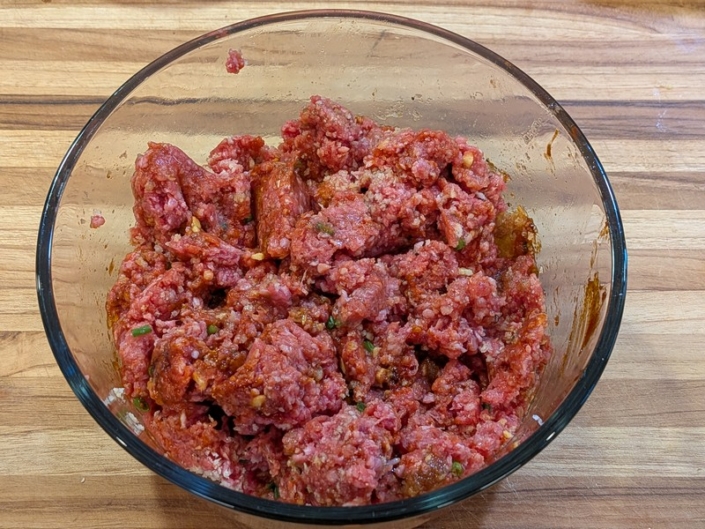 In a large bowl, gently mix together 1 pound ground beef (or 50/50 beef-pork mix), the green parts of 2 finely chopped green onions, 2 minced garlic cloves, 1 tablespoon freshly grated ginger, 2 tablespoons soy sauce, 1 tablespoon gochujang, 1 tablespoon brown sugar, 1 teaspoon sesame oil, 1 egg, 1/3 cup panko breadcrumbs, and 1/2 teaspoon black pepper.