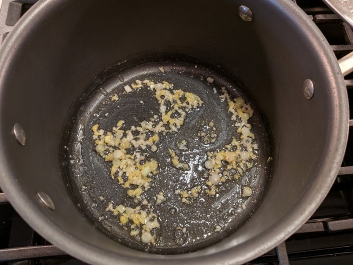 In a saucepan, heat 1 tablespoon sesame oil (or butter) over medium heat. Add 1 minced garlic clove, 1 teaspoon freshly grated ginger, and the white parts of 2 thinly sliced green onions (reserve greens for garnish). Sauté for 1 minute until fragrant.