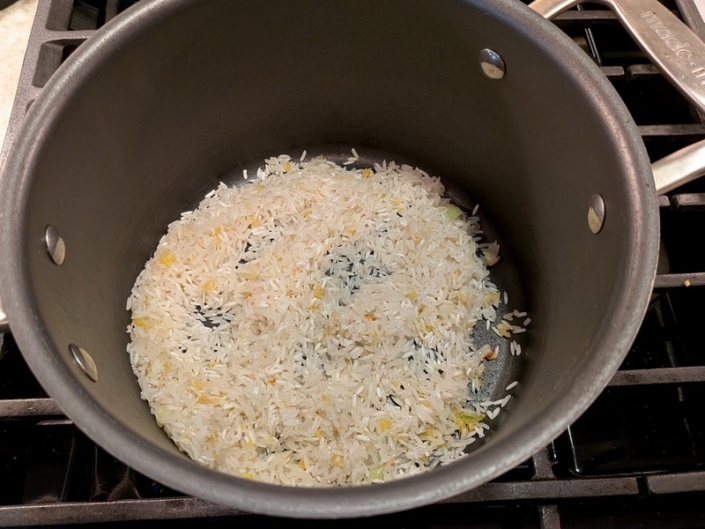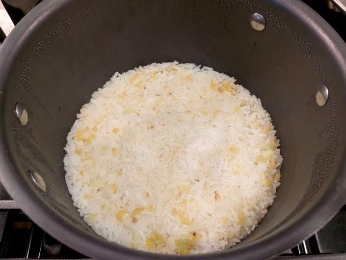 Stir in 1 cup uncooked jasmine or long-grain rice and toast for 1 minute.