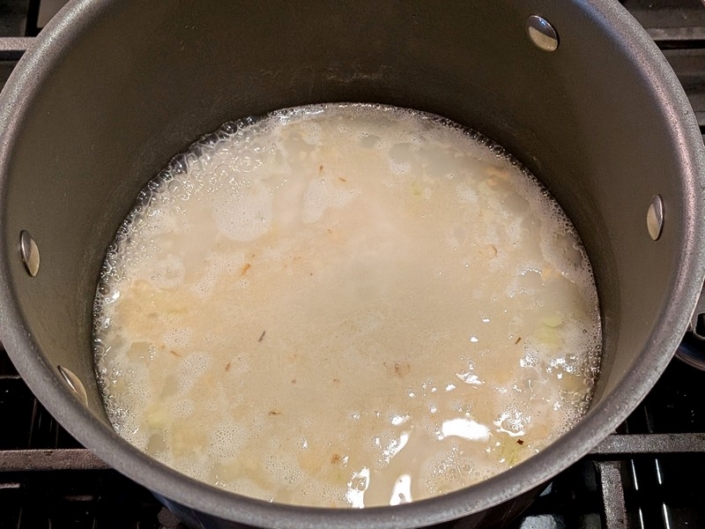 Pour in 2 cups low-sodium chicken broth (or water) and add a pinch of salt. Bring to a boil, then cover, reduce heat to low, and simmer for 15 minutes.