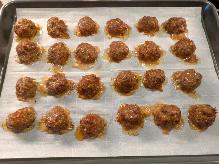In a large bowl, gently mix together 1 pound ground beef (or 50/50 beef-pork mix), the green parts of 2 finely chopped green onions, 2 minced garlic cloves, 1 tablespoon freshly grated ginger, 2 tablespoons soy sauce, 1 tablespoon gochujang, 1 tablespoon brown sugar, 1 teaspoon sesame oil, 1 egg, 1/3 cup panko breadcrumbs, and 1/2 teaspoon black pepper. Form into meatballs about 1 1/2 inches in diameter, being careful not to overwork the mixture.
