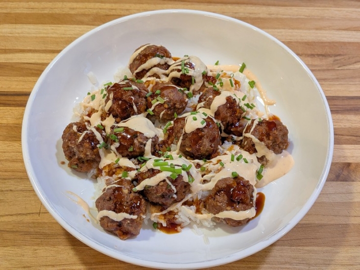 A flavorful Korean-inspired rice bowl featuring scallion-ginger rice, juicy gochujang-glazed meatballs, and a drizzle of spicy mayo for the perfect balance of savory, sweet, and heat.