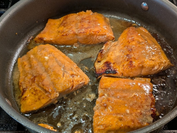 Preheat oven to 375°F (190°C). Heat a skillet over medium, add a little oil, and sear salmon skin-side up for 2–3 minutes until browned. Flip, spoon some marinade on top, then transfer skillet to the oven. Bake 6–8 minutes until cooked through and sticky.