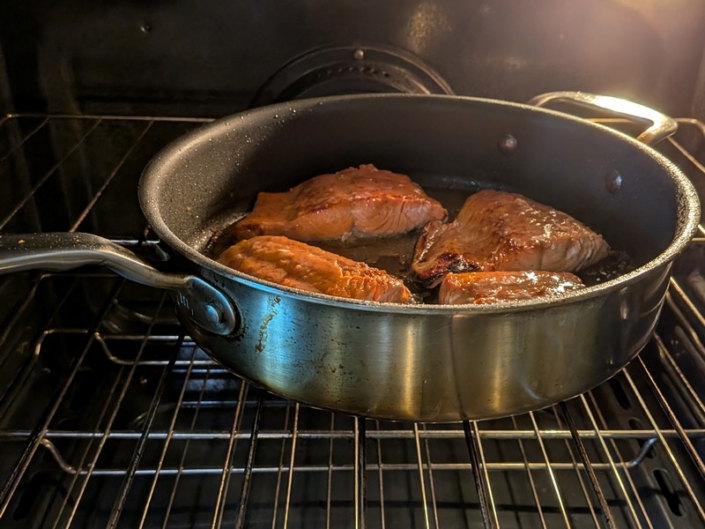 Flip, spoon some marinade on top, then transfer skillet to the oven. Bake 6–8 minutes until cooked through and sticky.