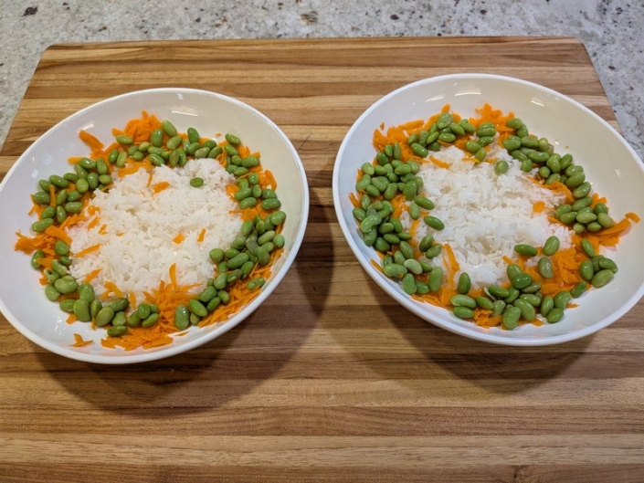 Divide cooked rice into two bowls. Arrange carrots and edamame around the rice.