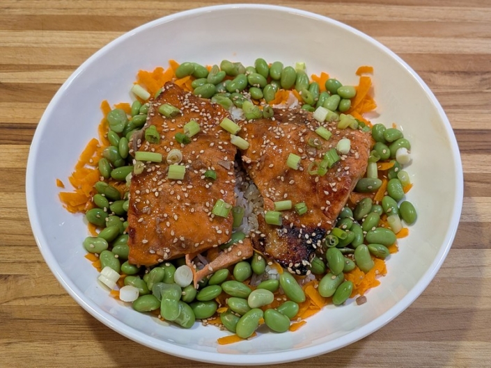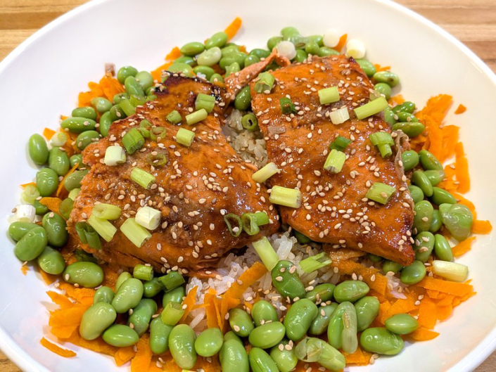 A sweet-savory miso honey–glazed salmon served over rice with crisp vegetables and edamame for a colorful, nourishing bowl.